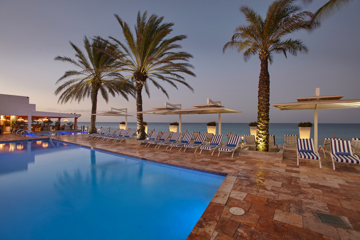 Item32, Link to Larger Image, a pool with palm trees and a building with a beach and a building a pool with palm trees and a building with a beach and a building